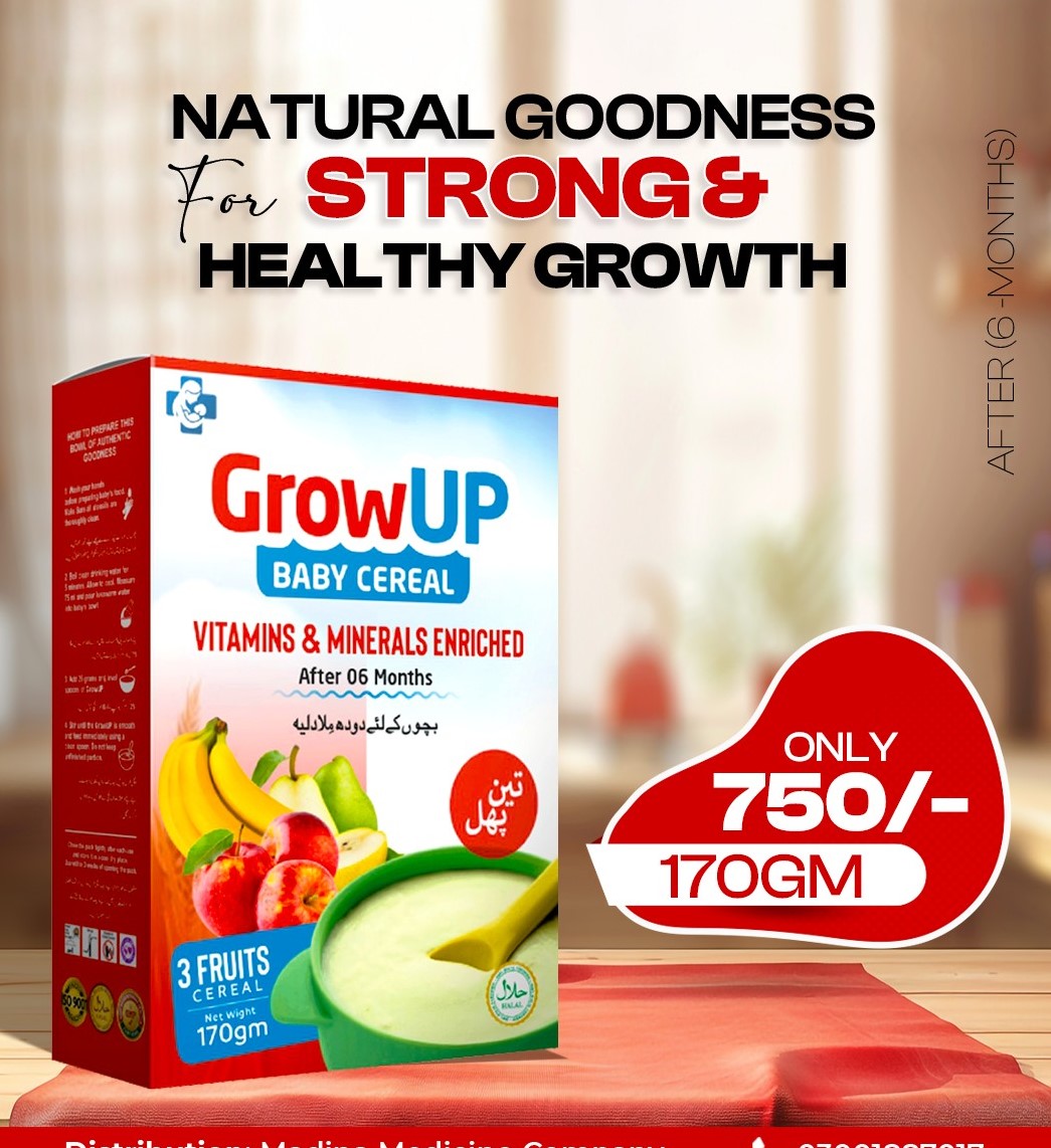 GrowUP Baby Cereal is enriched with essential Vitamins & Minerals for strong & healthy growth after 6 months.