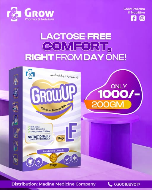 GrowUp LF by Grow Pharma & Nutrition is specially formulated for infants with lactose sensitivity β€” providing complete, balanced nutrition without discomfort.