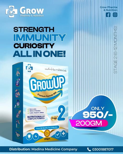 GrowUP Stage 3 formula milk is specially designed for babies aged 12 to 18 months β€” packed with DHA, ARA, HMOs, Prebiotics, Lutein, Vitamin E, and Bifidus to support healthy brain development, immunity, and active growth.